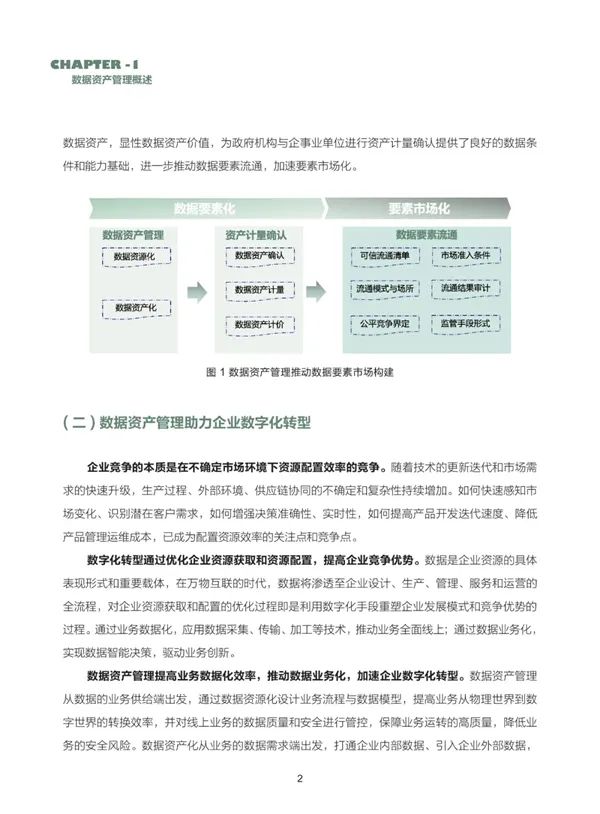 良好的数据资产管理是释放数据要素价值的基础。数据资产管理包含数据资源化、数据资产化两个过程,通过数据资源化构建全面有效的、切合实际的数据资产管理体系,提升数据质量,保障数据安全;通过数据资产化,丰富数据资产应用场景,建立数据资产生态,持续运营数据资产,显性数据资产的业务价值、经济价值和社会价值。