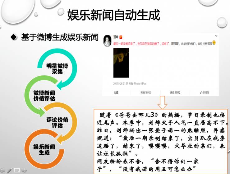 还有一个是娱乐新闻的自动生成,娱乐新闻有很多不同的生成方式。比如说你可以根据明星的数据库,直接对这个明星做一个简单的描述。我们做的是可以借助明星的微博生成娱乐新闻。明星通常会发一些微博,有些微博会吸引大家的眼球,构成热新闻。我们有一个机器学习的手段,能自动判别明星发的哪一条微博具有新闻价值,再判断这个微博下面的哪些评论,具有新闻价值。把这个微博和它的评论以及相关的背景信息组合在一块,就可以形成一个比较短的新闻。