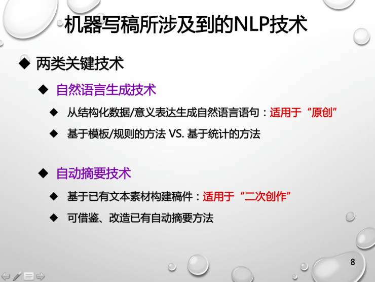 原创和二次创作所依赖的技术也是不太一样的。原创采用的是自然语言生成技术,是从结构化数据/意义表达生成自然语言语句。二次创作采用的是自动摘要技术,我们从已有的文字素材去给它摘要,把它生成一个新的稿件。这是两类非常关键的技术。