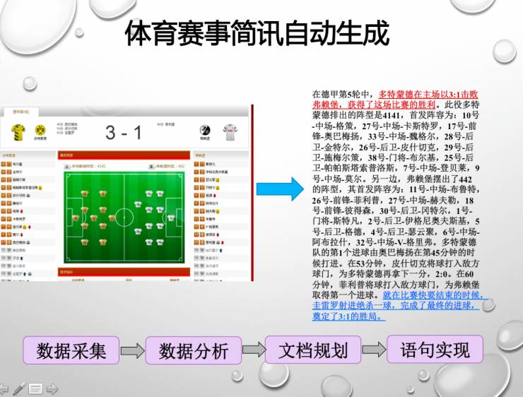 机器人写稿的应用十分广泛。首先是新闻资讯的自动生成。我们输入结构化的数据,以及已经有的稿件,可以生成长度可控的几十个字到几千字的稿件。例如,一个体育的简讯的生成需要我们从网上抓取关于体育赛事的一些基本的数据,借助这个数据做一些数据分析,文档规划、语句的实现,就可以生成右边的这样一个比较简单的体育的赛事报道。
