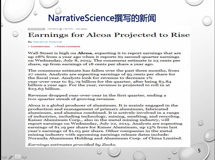 早在几年前,国外就已经有机器人写稿,最具代表性的是来自美国、欧洲的三家公司:ARRIA、AI、NARRATIVE SCIENCE。据说他们的机器人采用英语或者西方语言为著名的媒体网站写了数千万篇稿件。