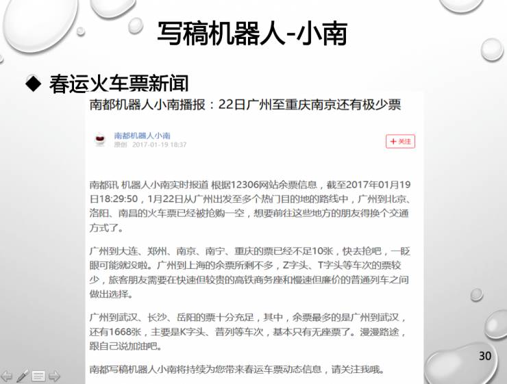 小南写稿机器人现在是在南方都市报的APP上撰写一些民生新闻,去年年底做过春运火车票的新闻撰写,侧重广州到其它大城市的新闻,最近写的是天气预报的新闻,在两会期间还写过两会的小南读报的新闻。