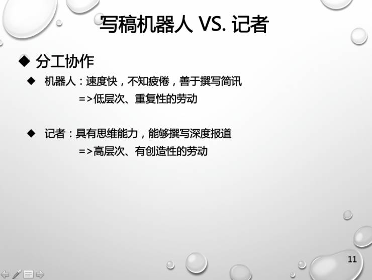 另外一个不同点就是,记者在写一个稿件的时候,他是很清楚地知道我在写什么,他知道自己要表达的语义。但实际上机器人在写这个稿件的时候,虽然他把每一个句子都写出来了,但实际上他不知道自己要写什么,这是最大的一个不同,就是说它没有理解自己的稿件,虽然它写出来了,包括机器人写诗,或者写各种歌词的时候,它也把那个语言写出来了,但是它并没有真正理解那个语言,所以这是一个比较大的不同。