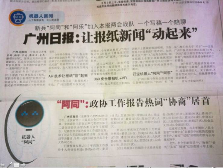 我们目前有三个合作的机器人写稿项目,一个是今日头条的“Xiaomingbot”小明机器人,南方都市报的“小南”,广州日报的“阿同”机器人。小明主要服务于奥运会,小南、阿同当时是给2017年的全国两会做了一些报道的工作。