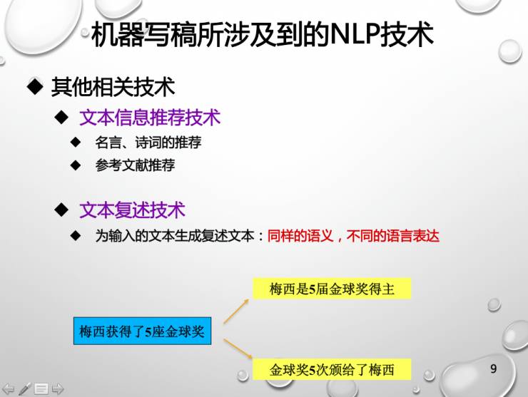 还有其它的一些相关技术:文本信息推荐技术和文本复述技术。比如说我们在写一个稿件的时候,有时候会想引用一句名人的话或者引用一个唐诗宋词,机器会自动给你推荐。第二个是文本复述技术,我们基于一个个稿件做创作的时候,如果我们直接把原文原始的内容拷贝过来,这个有点抄袭的嫌疑。所以这时候我们就需要做一些复述,会用不同的语言去表达同样的语义。这里有一个例子是说“梅西获得了5座金球奖”,你可以改为“梅西是五届金球奖得主”,也可以改写为“金球奖5次颁给了梅西”,这样就可以避免版权的问题,也可以让我们的改写更加生动。