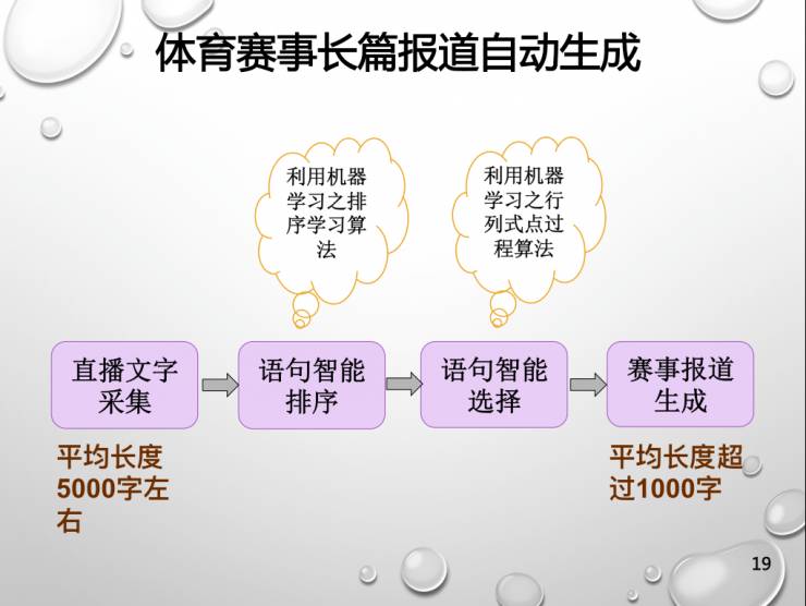 另一个是体育赛事的长篇报道的自动生成。简讯包含的信息量很少,我们想生成一个长篇的报道来介绍整个比赛的过程。我们经常发现著名的体育比赛下面都有文字直播,通常包含主持人对这样一个比赛的精彩细节的描述,我们通过机器学习的手段,能够把这些精彩的描述挑选出来,放到我们最终的报道中,这个报道就写得比较长,可以达到上千字以上。首先借助机器学习的手段,对直播文字进行语句的智能排序,再进行智能选择,最后生成一个平均长度超过1000字的赛事的报道。我们看到直播文字一般会达到数千字,一般是5000字以上,所以要从5000字中选择和拼凑出1000字以上的长篇报道。