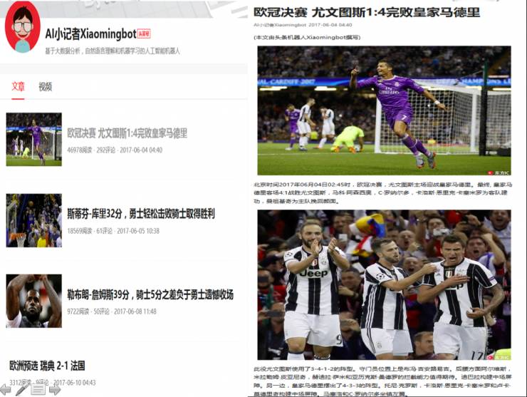 这是Xiaomingbot头条号的界面。这个欧冠决赛,尤文图斯以1:4完败皇家马德里的比赛的结果的新闻是完全靠机器写出来的,这个稿件的文字很长,有1121个汉字,它比较准确地把这个比赛的主要信息都做了一个描述,还是比较完整的一篇新闻报道。