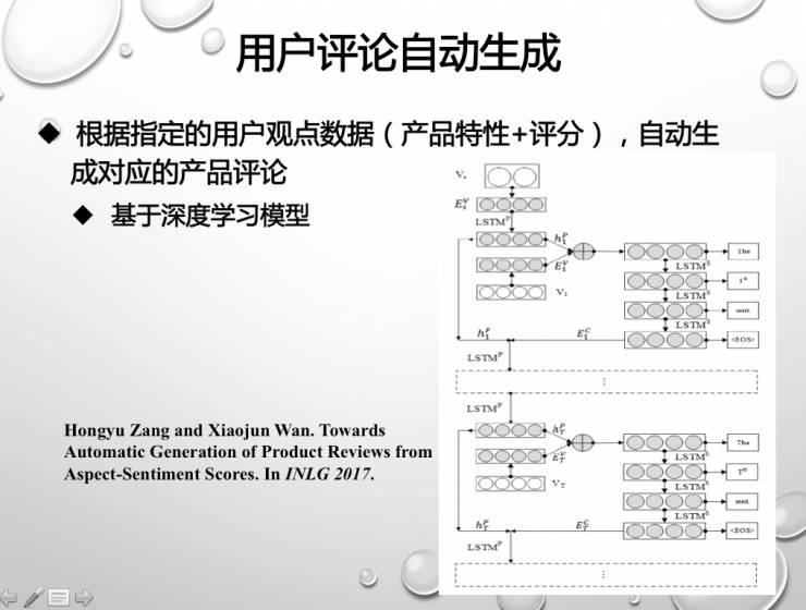 除了生成事实型的新闻之外,我们也尝试让机器人去生成用户的评论。我们输入对于产品的某一个特征或者某几个特征上的评分,比如我输入给这个软件的是我对这个汽车的操控性是5分评价,对它的外观是3分评价,根据这个评价会自动生成一个自然语言的评论。我们采用的是一个深度学习的模型,右边是这样一个模型的架构。我们提前可以看我们最终生成的这样一个例子。