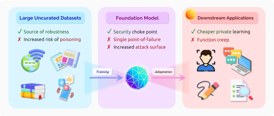 单点故障 一个基础模型被适配到多种应用意味着这些应用面临单点故障问题。例如,针对基础模型的数据投毒攻击:敌对者将恶意的样例插入基础模型的训练数据中,可能会影响该基础模型适配的所有应用。同样地,针对基础模型的对抗样例(即:导致模型输出特征发生较大变化的小输入扰动)可以很容易地转移到适配应用中。Wallace et al. [2019] 甚至发现:将单个对抗触发器添加到任意输入中都可以使得像 GPT-2 这样的语言模型输出预定义的文本片段。基础模型也可能成为数据隐私的单点故障。如果基础模型在公司的私有数据上预训练并记住了部分训练数据,那么所有的下游应用都面临着泄露这些数据的风险 [Carlini et al. 2021]。基础模型提供者可能也是应用数据隐私的单一信任点。例如,目前 GPT-3 的 API 要求将所有用于微调和推理的数据(可能是敏感的)上传到 OpenAI 的服务器。设计一种能够避免这种信任集中的基础模型服务是一个有趣的问题。
