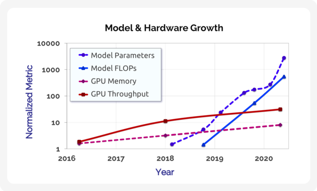 虽然我们将继续通过新硬件实现性能提升,但大型模型的资源需求增长远远超过硬件性能的增长 [Brown et al. 2020]。为了促进模型容量的下一次重大飞跃并使模型性能的进步能够民用化,协同设计训练算法、模型、软件和硬件将变得越来越重要,事实上提高性能的许多途径改变了训练计算的含义。举例来说,以较低精度执行操作(例如 fp16)有助于提高现代硬件的吞吐量(例如,V100 和A100 GPU 具有用于较低精度矩阵乘法的专用张量核心单元),虽然这也会影响数值优化程序 [Micikevicius et al. 2017]。同样,利用权重稀疏性可以通过只对模型中的非零值进行数学运算显著降低训练和推理时间[Elsen et al. 2020; Gale et al. 2020], 但需要不同的训练算法[Jayakumar et al. 2021; Evci et al. 2020; Dettmers and Zettlemoyer 2019]。协同设计的其他示例包括更直接映射到硬件的模型架构[So et al. 2019; Child et al. 2019; Wang et al. 2020c; Lee-Thorp et al. 2021; Kitaev et al. 2020; Beltagy et al. 2020; Tay et al. 2020; Ren et al. 2021],高效的优化器 [Anil et al. 2020; Shazeer and Stern 2018],新颖的标记化替代方案 [Xue et al. 2021; Tay et al. 2021],专门构建的硬件训练平台 [Jouppi et al. 2017; Mudigere et al. 2021; Selene 2021],以及具有宽松权重更新机制的分布式并行化策略 [Narayanan et al. 2019, 2021a].