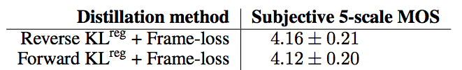 接着我们将一个60层的并行学生网络从20层的高斯自回归WaveNet中进行蒸馏,它包括6个堆叠的高斯逆自回归流,每个流都由一个10层的WaveNet进行参数化。我们测试了前向和逆向KL散度,结果如下: