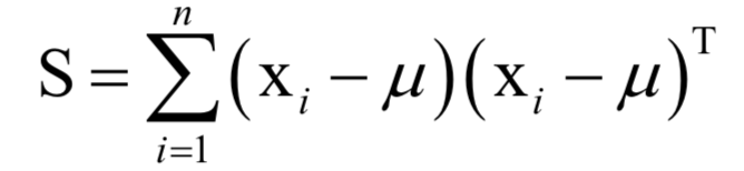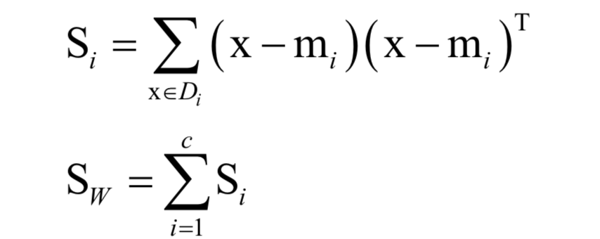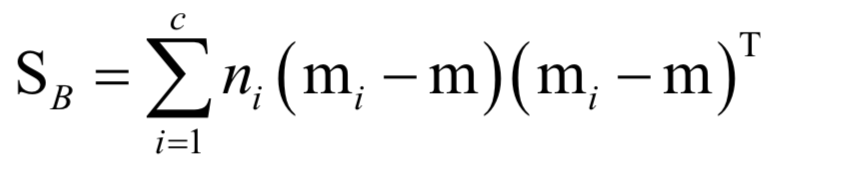 它衡量的内类样本的发散程度。其中mi为每个类的均值向量,m为所有样本的均值向量。类间散布矩阵定义为:
