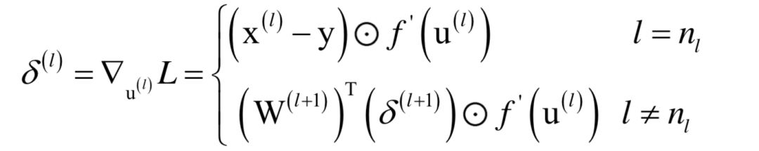 权重和偏置通过训练得到,采用的是反向传播算法。反向传播算法从复合函数求导的链式法则导出,用于计算损失函数对权重,偏置的梯度值。算法从最外层的导数值算起,依次递推的计算更内层的导数值,这对应于从神经网络的输出层算起,反向计算每个隐含层参数的导数值。其核心是误差项的定义,定义误差项为损失函数对临时变量u的梯度: