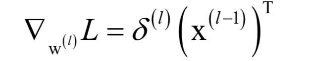 其中,nl是神经网络的层数。最后一个层的误差项可以直接求出,其他层的误差项根据上面的递推公式进行计算。根据误差项,可以计算出损失函数对每一层权重矩阵的梯度值: