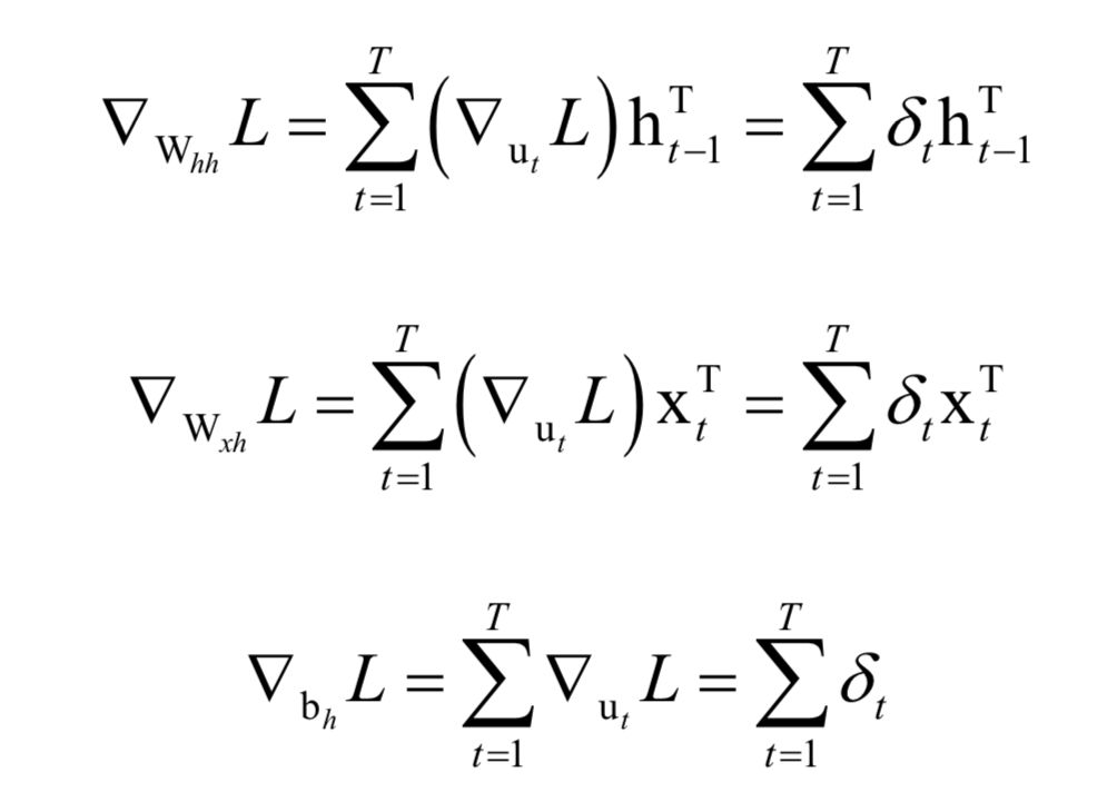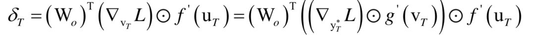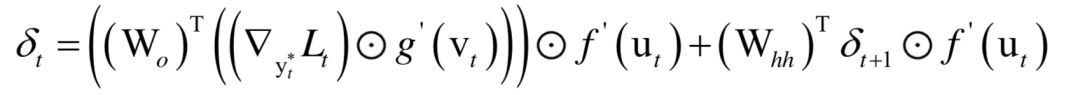 这和普通神经网络没什么区别。由于引入了循环层,因此反向传播算法有所不同,称为BPTT,即时间轴上的反向传播算法。算法从最后一个时刻算起,沿着时间轴往前推。误差项的递推公式为: