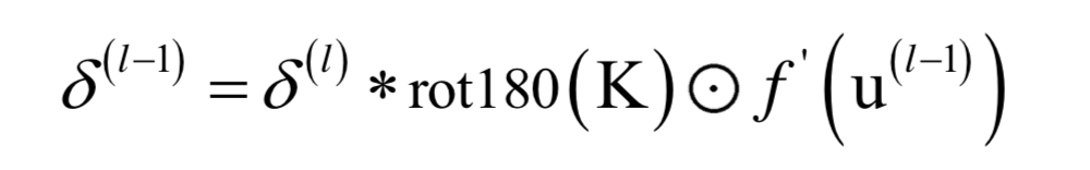 由于引入了卷积层和池化层,因此反向传播算法需要为这两种层进行考虑。卷积层误差项的反向传播的公式为