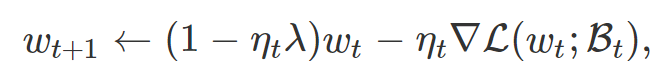 λ表示权重衰减 (WD) 因子(或者ℓ2 - 正则化系数),ηt 表示学习率,Bt 表示 batch,∇L(wt,Bt)表示 batch 梯度。