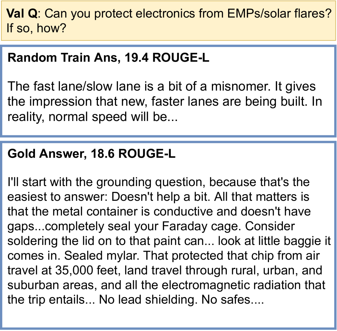 此外,在使用 Rouge-L 指标和平凡无意义基线(如随机训练集答案和输入复制)来评估文本生成质量的过程中,我们发现了一些问题,并导致 Rouge-L 分数相对较高(甚至超过了 BART + DPR 和 RAG)。