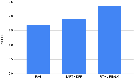 为了证明 RT 模型在 LFQA 任务中的有效性,我们将其与 REALM 中检索到的内容结合使用。REALM 模型(Guu 等人于 2020 年发布)是基于检索的模型,使用最大内积搜索来检索与特定查询或问题相关的维基百科文章。我们对该模型进行了微调,以便根据自然问题数据集作出事实型问答。REALM 利用 BERT 模型学习问题的良好表征,并使用 SCANN 检索与问题表征具有高度主题相似性的维基百科文章。接着进行端到端训练,以最大程度地提高 QA 任务的对数似然值。