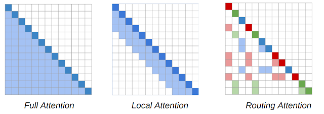 注意力地图(针对在 Routing Transformer 中使用的基于内容的稀疏注意力机制)。单词序列由对角深色方块表示。在 Transformer 模型中(左),每个Token 都关注其他 Token。阴影方块表示给定 Token(黑色方块)正在关注的序列中的 Token。RT 模型使用局部注意力机制(中),其中 Token 仅关注其局部邻域中的其他 Token;同时也使用路由注意力机制(右),其中 Token 仅关注上下文中与其相关性最强的 Token 集群。深红色、绿色和蓝色 Token 仅关注对应浅色的阴影 Token。