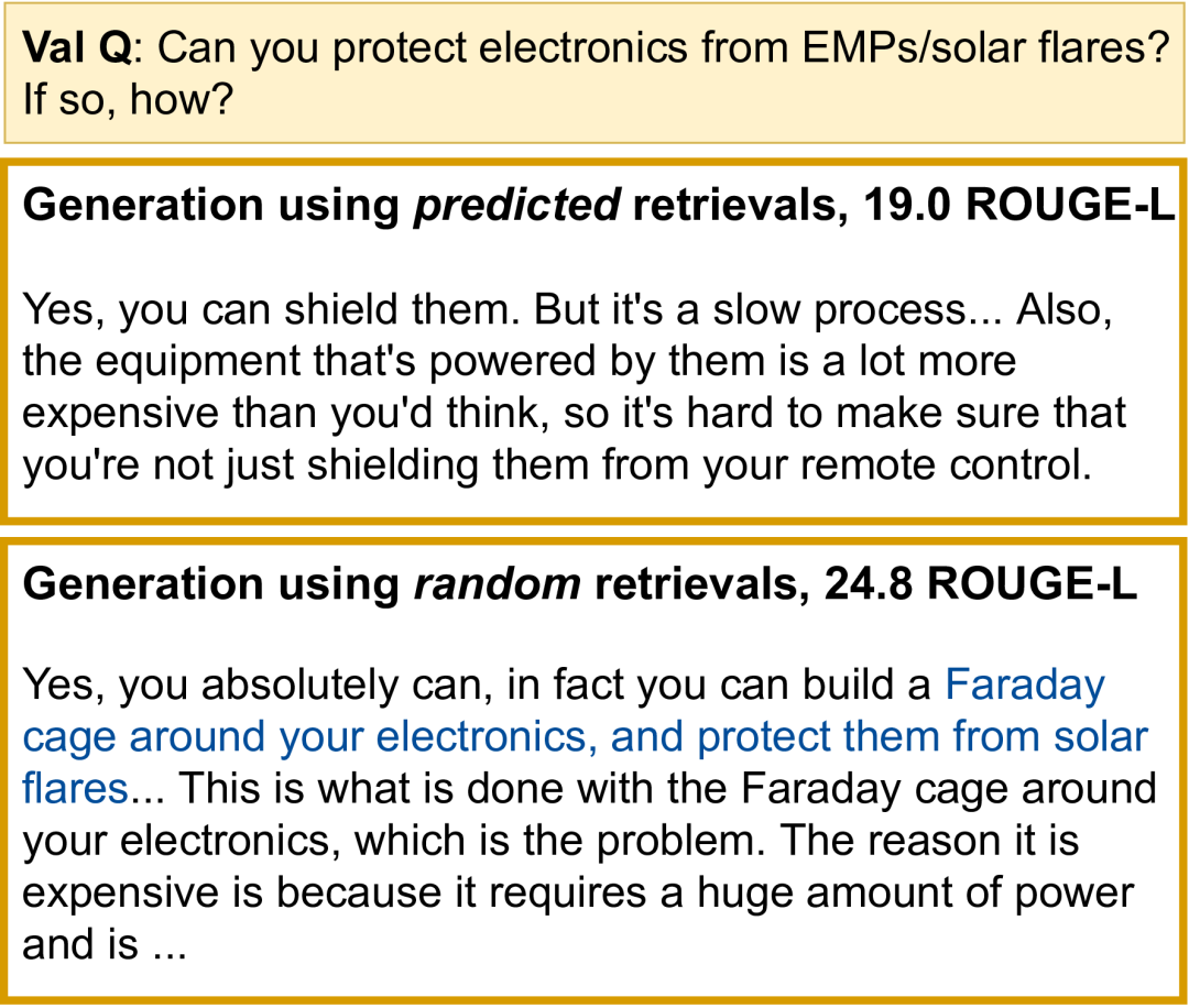 我们发现,几乎没有任何证据表明模型会将其文本生成实际定位到检索文档中。与 Wikipedia 中的随机检索搭配使用的微调 RT 模型(例如,随机检索 + RT),几乎与 c-REALM + RT 模型(24.2 与 24.4 ROUGE-L)表现得一样好。在训练、验证和测试 ELI5 数据集时,我们还发现了很多的重叠(几个问题相互解释),因此可能不再需要检索。KILT 基准会单独衡量检索和生成的质量,但不确定文本生成是否会在实际情况中使用检索。