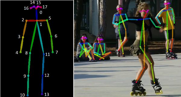 图:左:COCO 关键点格式的人体骨架。右:将骨架映射到人体图片上。(图片来源:https://github.com/CMU-Perceptual-Computing-Lab/openpose)