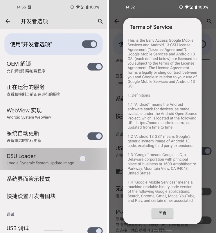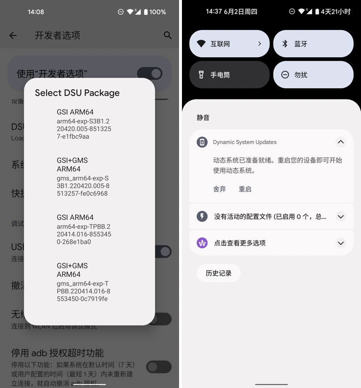选好想要安装体验的版本,点击同意 Google 的使用条款后,系统就会在后台进行下载和安装了。准备就绪后你会看到一条通知,点击通知就能重启并体验新系统了。在 DSU 加载的系统中,我们可以随时通过通知中的重启按钮或直接重启设备来切换回主系统。