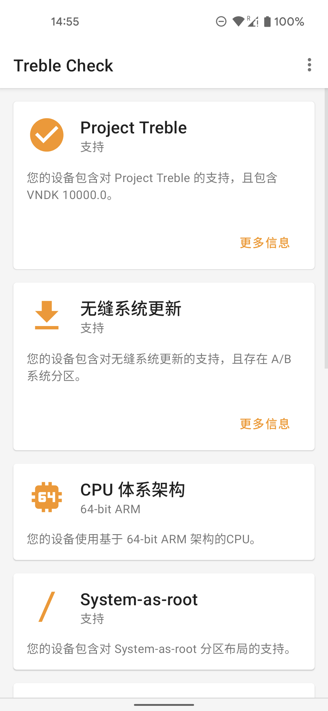 如果你不确定自己的设备是否支持动态分区特性,建议先下载安装 Treble Check 这个应用打开看看。