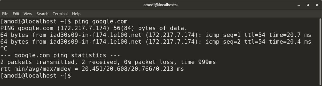 正如它的名字所表示的那样,ping 是用于去检查从你的系统到你想去连接的系统之间端到端的连通性。当一个 ping 成功时,它使用的 ICMP[1] 的 echo 包将会返回到你的系统中。它是检查系统/网络连通性的一个良好开端。你可以在 IPv4 和 IPv6 地址上使用 ping 命令。(阅读我的文章 "如何在 Linux 系统上找到你的 IP 地址[2]" 去学习更多关于 IP 地址的知识)