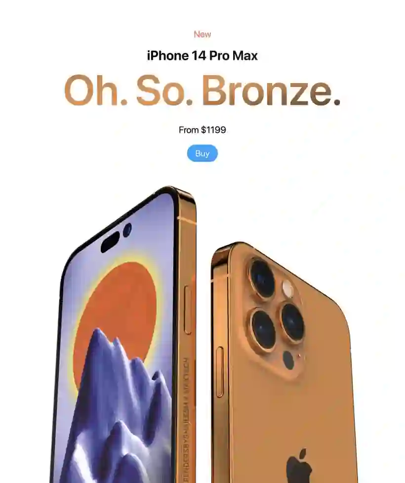 据国外网友爆料,今年的 iPhone 14 Pro 或将会新增一款全新的配色—— 古铜色 ,并放出了该配色的渲染图。据图片来看,古铜色类似于以前的土豪金与现在 iPhone 13 系列金色的结合颜色,第一眼看上去满满的印度风。据此前的爆料, iPhone 14 系列除了古铜色外,可能还将新增紫色配色,还有银色、绿色配色等多款配色。
