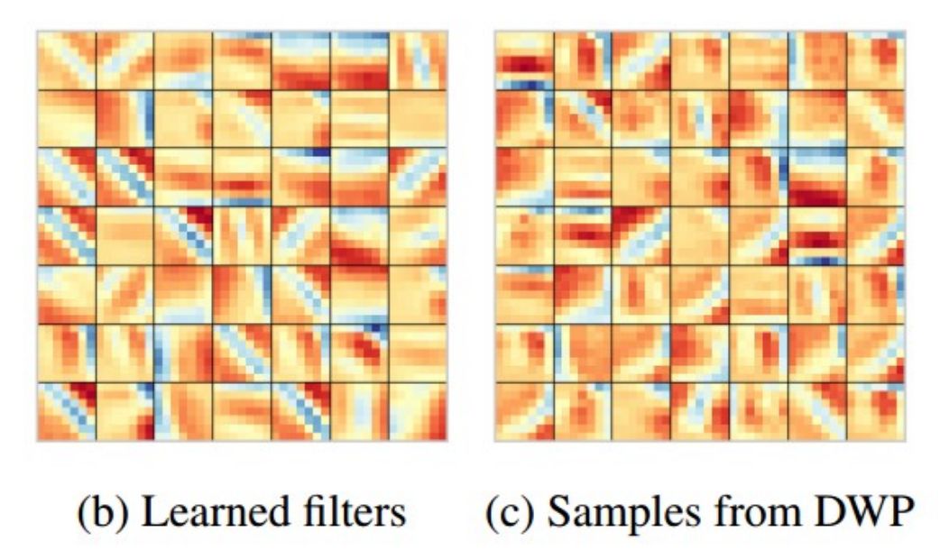 具体地讲,本文在 cifar10 数据集上用两层的 5 * 5 和 7 * 7 卷积核作为网络结构,分别训练了 CNN,从中获取了这两类网络架构的权重值作为数据进行学习。学习得到权重的implicit distribution 之后,作为具有同样结构的Bayesian CNN 的权重的 prior 来应用。