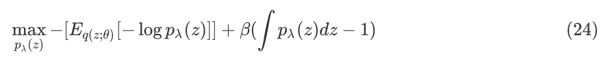 为了保证 ELBO 最大化,需满足第三项也最大化,问题在于如何找到一个合适的先验分布 ,描述参数为 ,使得其拉格朗日乘子表达式最大:
