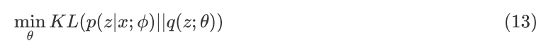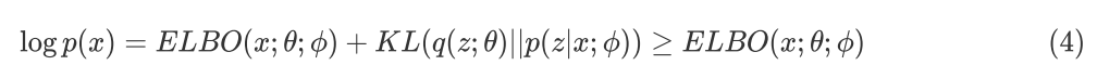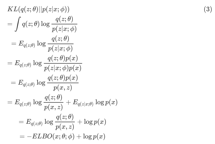 由 KL Divergence 的定义可知, KL(q(z;θ)||p(z|x;ф))≥0,同时 logp(x;ф) 是个常数,所以求优化问题(2)等价于求如下优化问题: