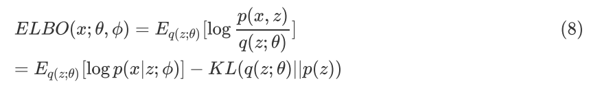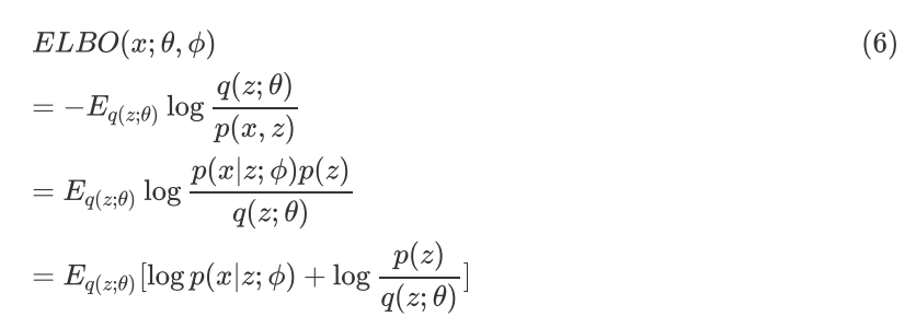公式(6)和公式(7)是一致的,所以求变分后验分布与真实后验分布 KL Divergence 的最小化等价于求 ELBO 的最大化,而 ELBO 的具体形式如(6)(7)所示,进一步整理可得: