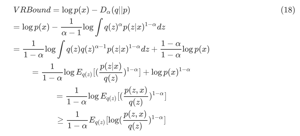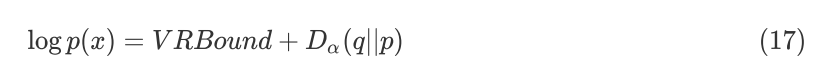 用 Renyi α-Divergence 来代替公式(16)中的 KL Divergence,定义Variational Renyi Bound(VR Bound,Rényi Divergence Variational Inference),将公式(14)代入可得: