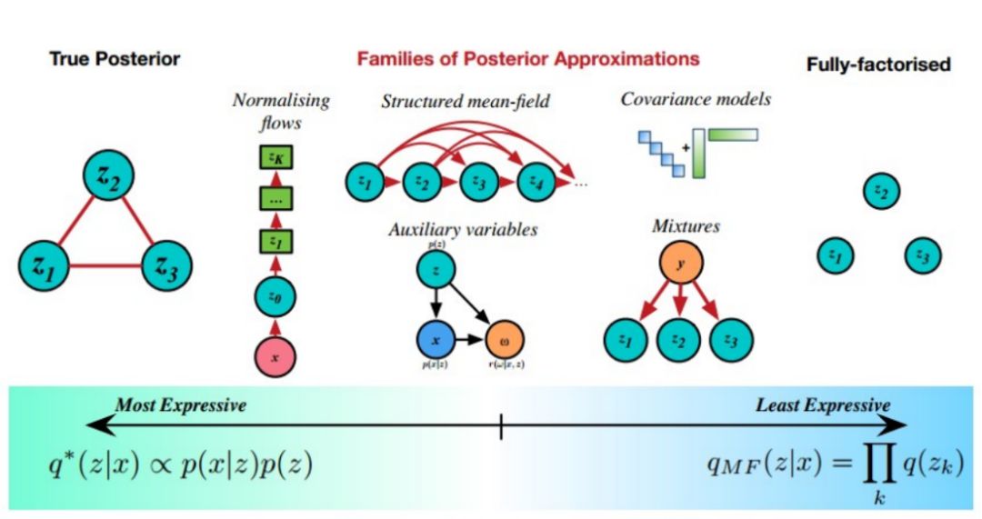 上图中,最右边表示分布簇表达能力最弱的 MF,最左边表示表达能力最强的真实后验,中间方法都是对 MFVI 的改进,通过复杂化后验分布来降低 bias。