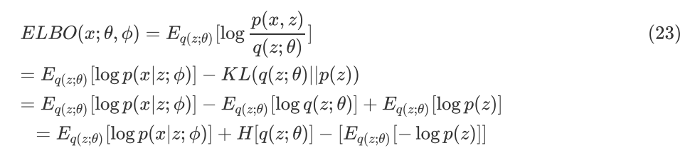 公式(23)中第一项是重建的似然函数,第二项是变分后验分布的熵,第三项是负的变分后验分布和先验分布的交叉熵。