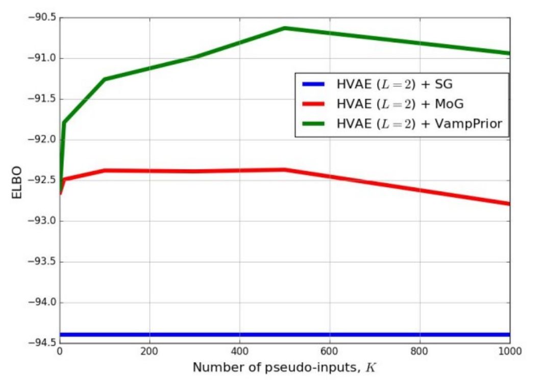 AISTATS 2018 一篇来自 Max Welling 组的工作,提出了一种新的复杂先验分布 VampPrior(Variational Mixture of Posteriors Prior),并且在 VAE 上进行了实验测试,相比标准的高斯分布先验和混合高斯分布先验有更好的 Log Likelihood 和表示学习效果。思路如下: