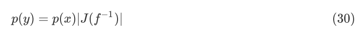 其中,p(y) 是 y 的分布,p(x) 是 x 的分布,这里 y=f(x),J 是指雅可比矩阵,即多元函数一阶导数矩阵。