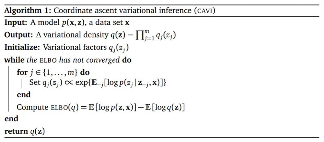 可以利用坐标上升法(Coordinate Ascent, CAVI)来迭代求解该优化问题,具体算法参见下图: