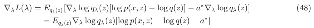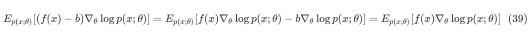 这样会带来非常多的便利,比如:一种降低估计方差的思路,将代价函数 f(x) 改造为 f(x)-b ,其中 b 是所谓的 baseline。因为 score function 的期望为 0,所以: