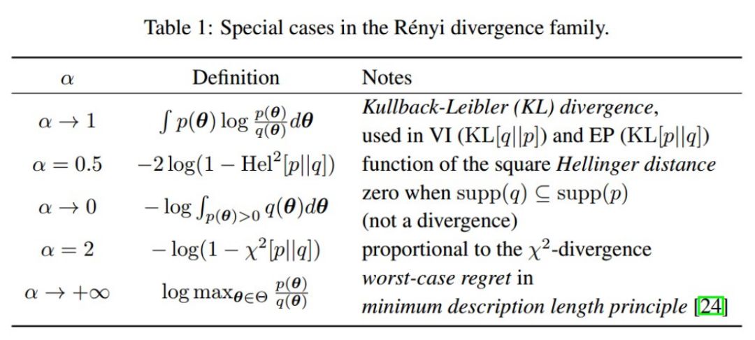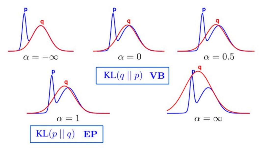 除了 Renyi 的定义,还有很多不同的定义,有的定义会恰好可以统一VI 和 EP 两种方法,如下图所示,当 α=0 时,该 Divergence 等价于 KL(q||p),相当于是 VI 方法;当 α=1 时,该 Divergence 等价于 KL(p||q),相当于是 EP 方法。