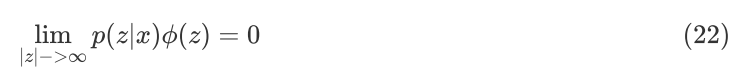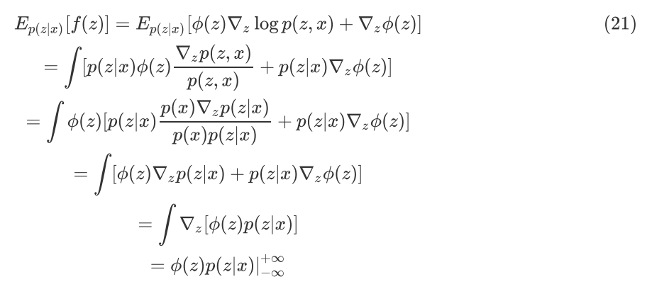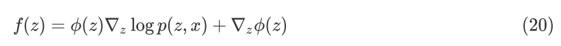 公式(19)中的右边一项包含了未知的真实后验分布 p(z|x) ,无法计算。如何构造一些合适的 f(z) 可以使得 Ep(z|x)[f(z)]=0 ,从而消除掉未知分布的影响。Stein 的方法给出了一类合适的 f(z) ,如下: