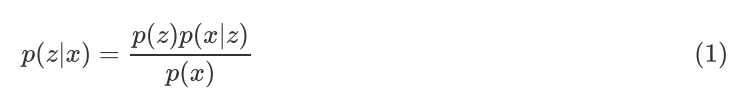 其中,p(z) 是先验分布,p(x|z) 是似然函数, p(x)=∫p(z)p(x|z),称为 evidence,通常 p(x) 是一个不可积的多重积分,导致后验分布 p(z|x) 无法获得解析解,同时因为 p(x) 只与确定的观测变量有关,在计算时可认为是一个常数。