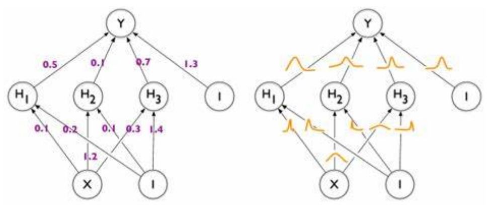 贝叶斯神经网络不同于一般的神经网络,其权重参数是随机变量,而非确定的值。如下图所示: