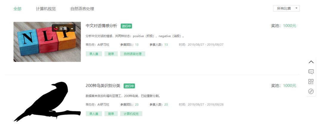 以目前上线的 2 场比赛为例(中文情感对话分析 & 200种鸟类识别分类),我们共设置了 3 种奖项:
