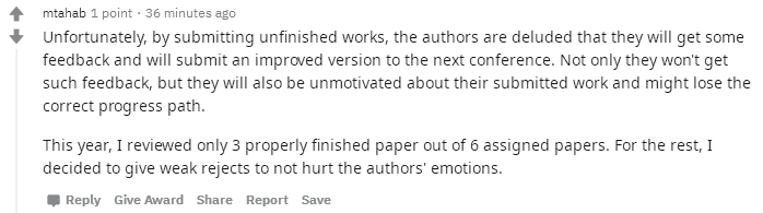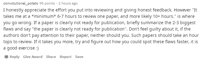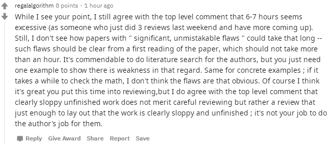 帖子一发到reddit上,立即引起了网友们的讨论,讨论的焦点在于6-7个小时审稿一篇未完稿的是否意味着浪费、这些投稿者的动机是什么以及呼吁机器学习社区的学者“谨慎”发表论文。