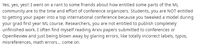 机器学习社区的人都有资格投顶会,占用议组织者的时间和努力么?研究生一年级的学生,大多是对已有的模型修修改改,发表在Arxiv上的论文大多数都有一些标签错误、数学错误......