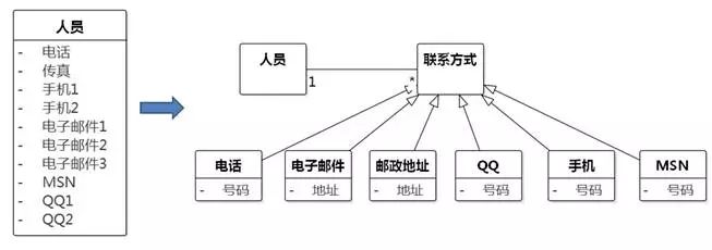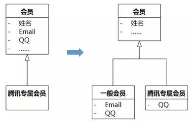 在日常应用中也有类似于矩形和正方形的情况。例如,会员的Email和QQ可以自由变化,但有一种会员,我们姑且称为“腾讯专属会员”,他的Email只能用他QQ号下的QQ邮箱,Email和QQ两个属性之间有依赖,那么图8-87左侧关系是不合适的,应该改为右侧的关系。