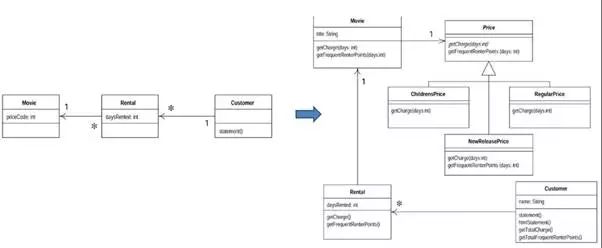 不过,如果具备一些领域建模知识,一眼就可以知道图8-9左侧类图犯了后文阐述的“照猫画虎”的错误,类图长得像用例图。系统的重要价值在于封装了Movie和Price之间的秘密。根本就不需要先走很多弯路再回正路。摸着石头过河是难免的,但应该在不得不摸的时候才摸,不应该假装看不见前人已修好的桥,无论大小事都主动追求摸着石头过河。